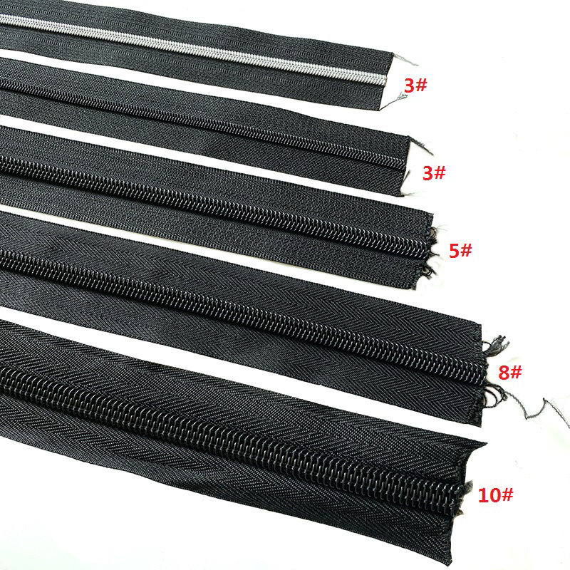 Coil zippers are made from a continuous coil of monofilament in place of individual teeth. Coil zippers are often referred to as nylon zippers. The teeth of these zippers are extruded nylon strip sewn onto the zipper tape. These zippers are very flexible and are available in a variety of sizes (gauges). Coil zippers have many applications from fashion-wear to all types of tents and canvas goods and bags.